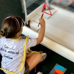 💡 A ideia foi estimular a turma a identificar as diferentes formas geométricas encontradas nos objetos e brinquedos da sala, e depois reproduzi-las em uma pintura bem atípica.