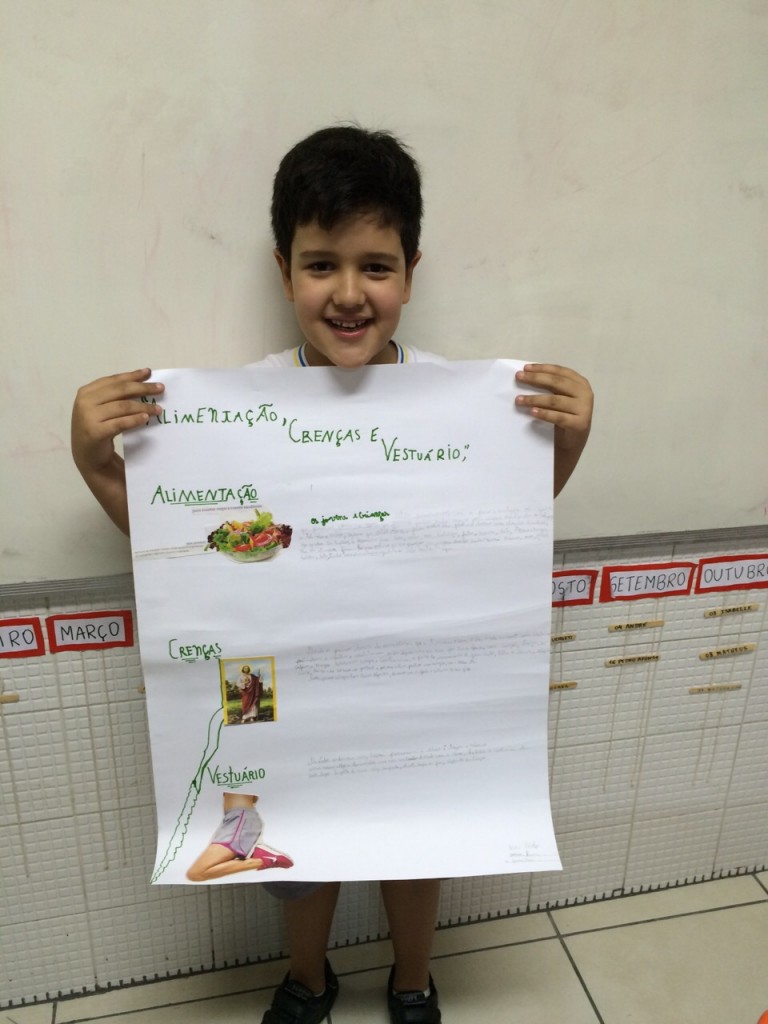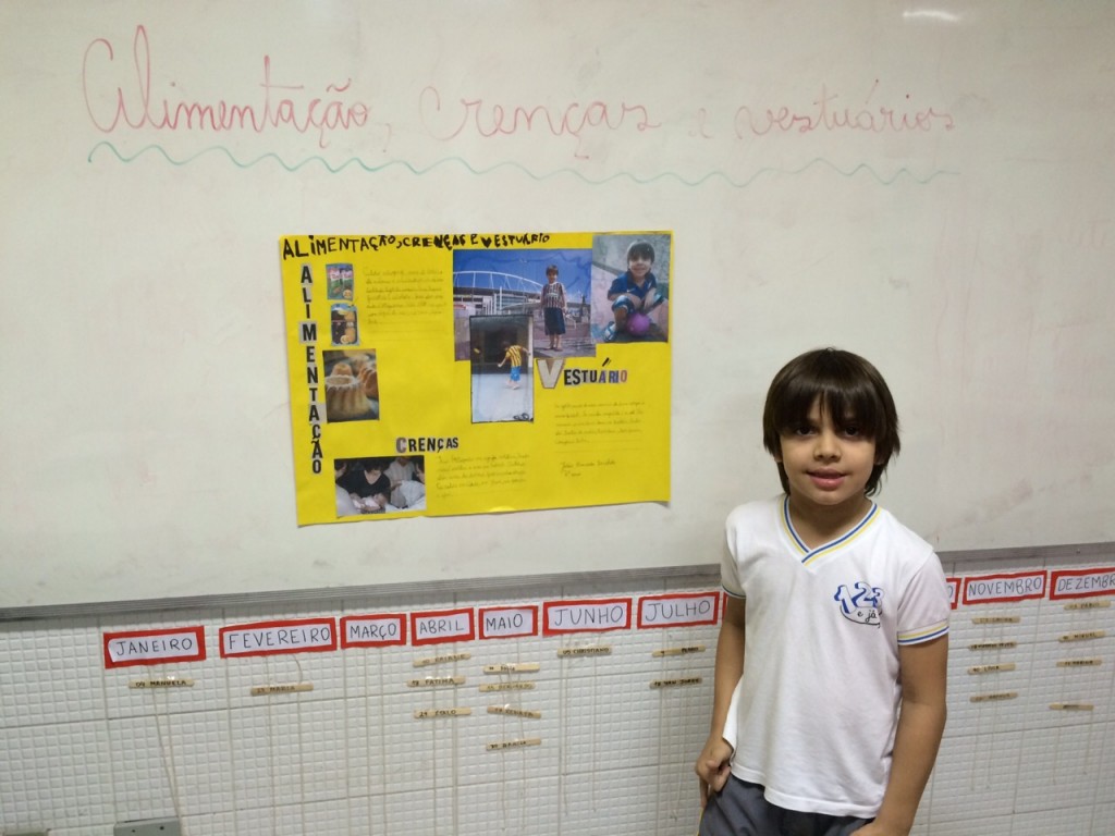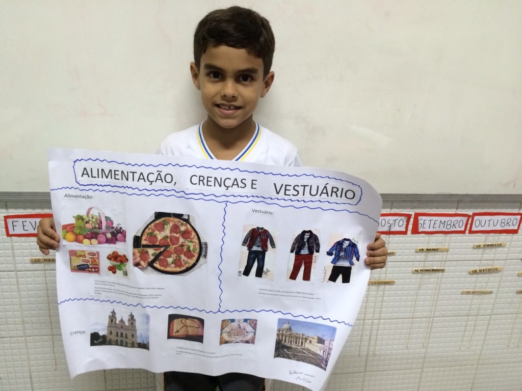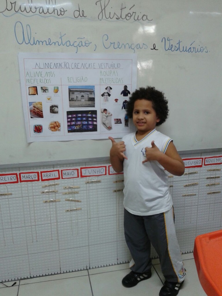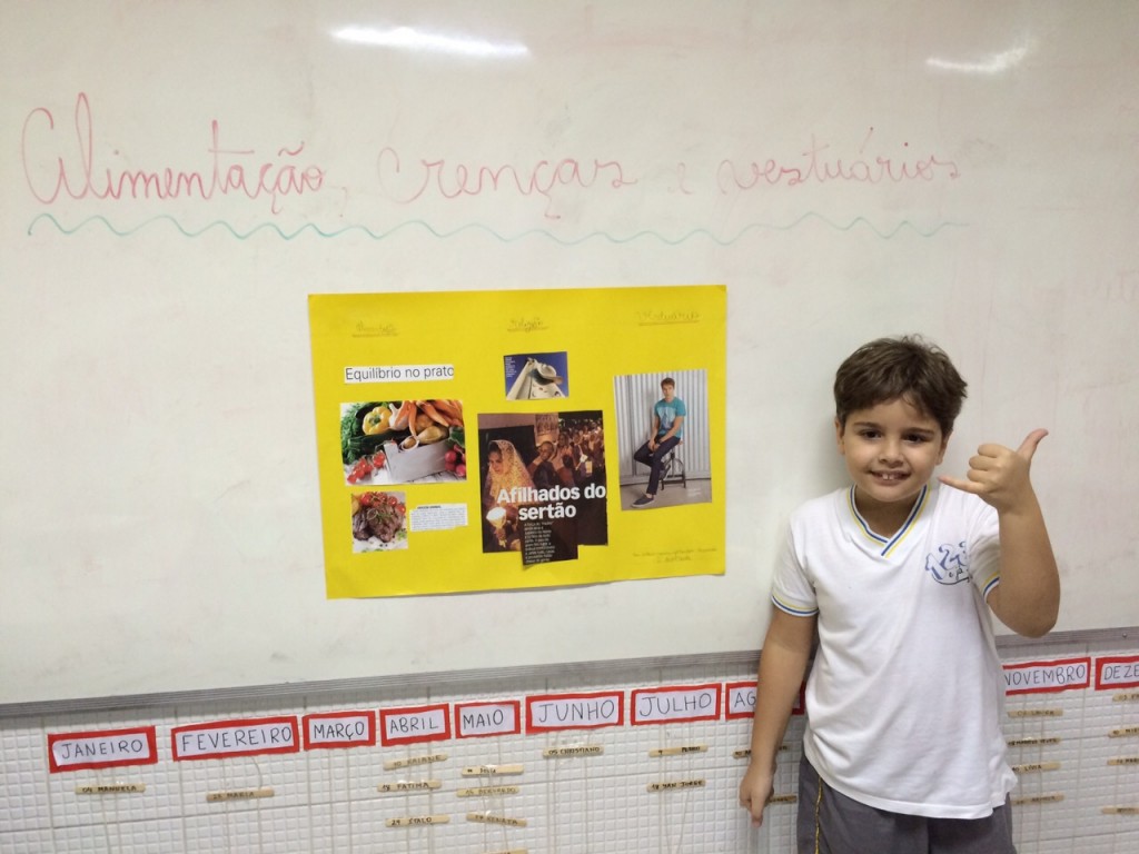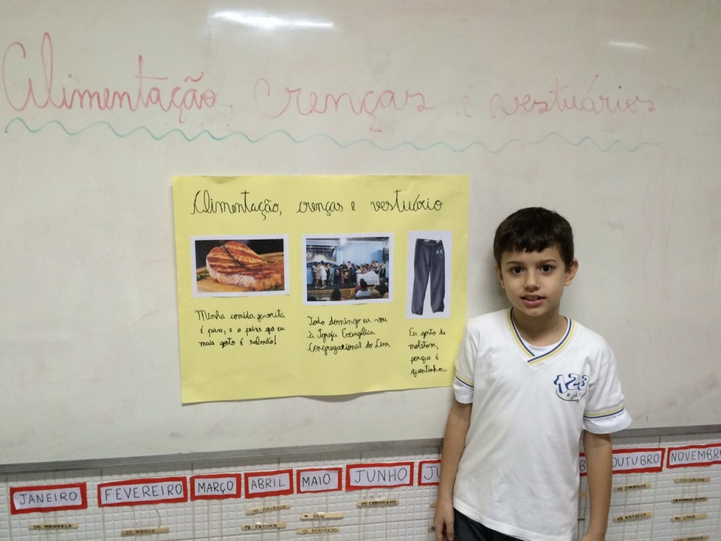 O cartaz preparado pelos alunos explorava o conteúdo de História (Vivendo em família, o dia a dia das famílias, os costumes da cada família, Famílias e costumes diferentes). Mas não bastava criatividade na execução! Era preciso vencer a timidez e apresentar. E eles se saíram super bem. Parabéns, 2º ano!