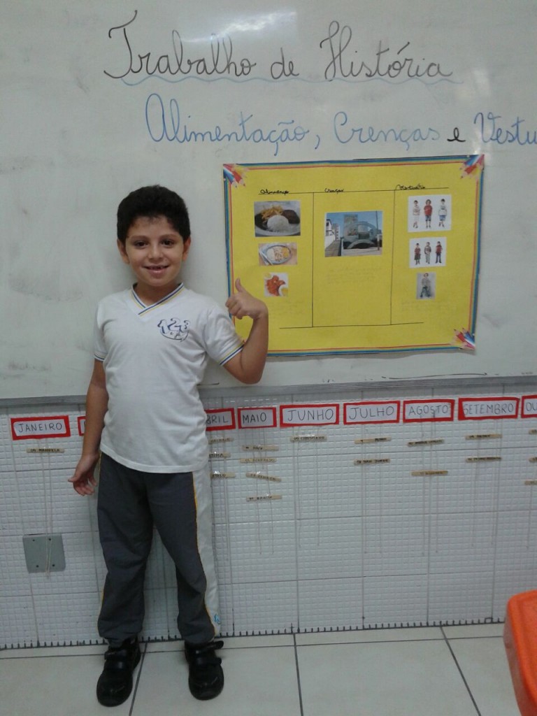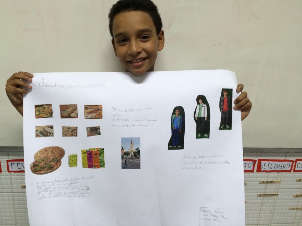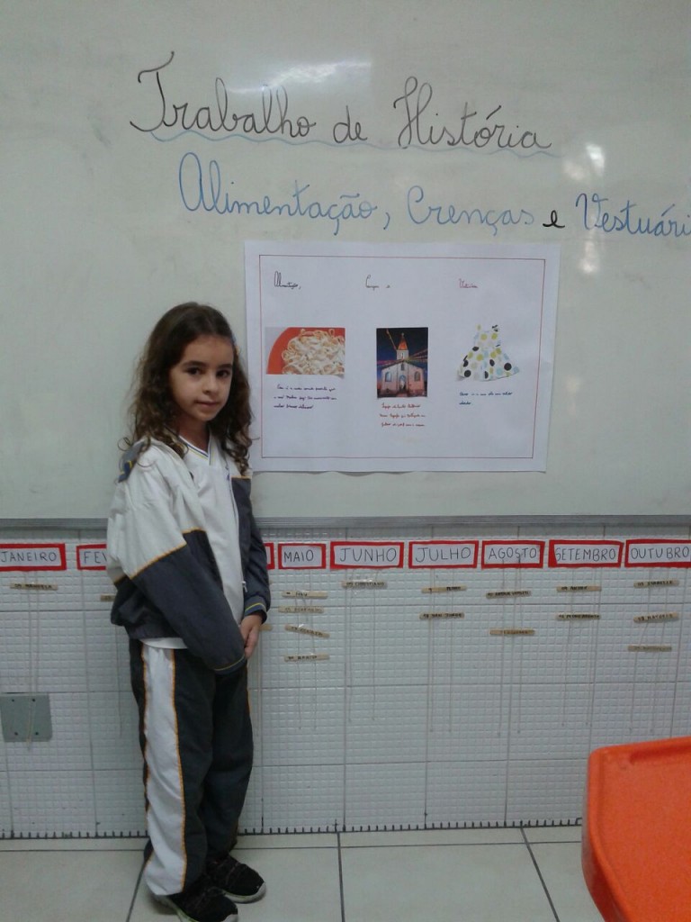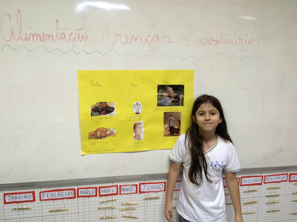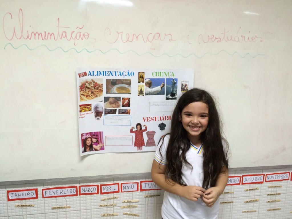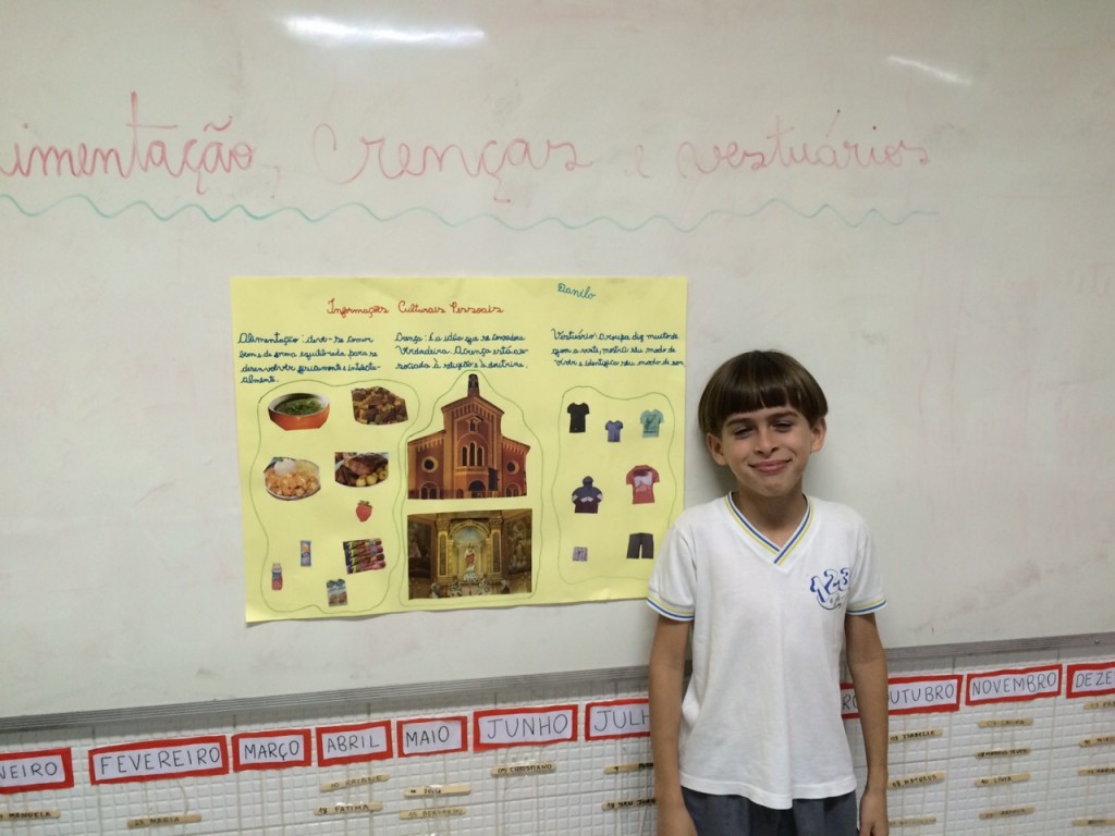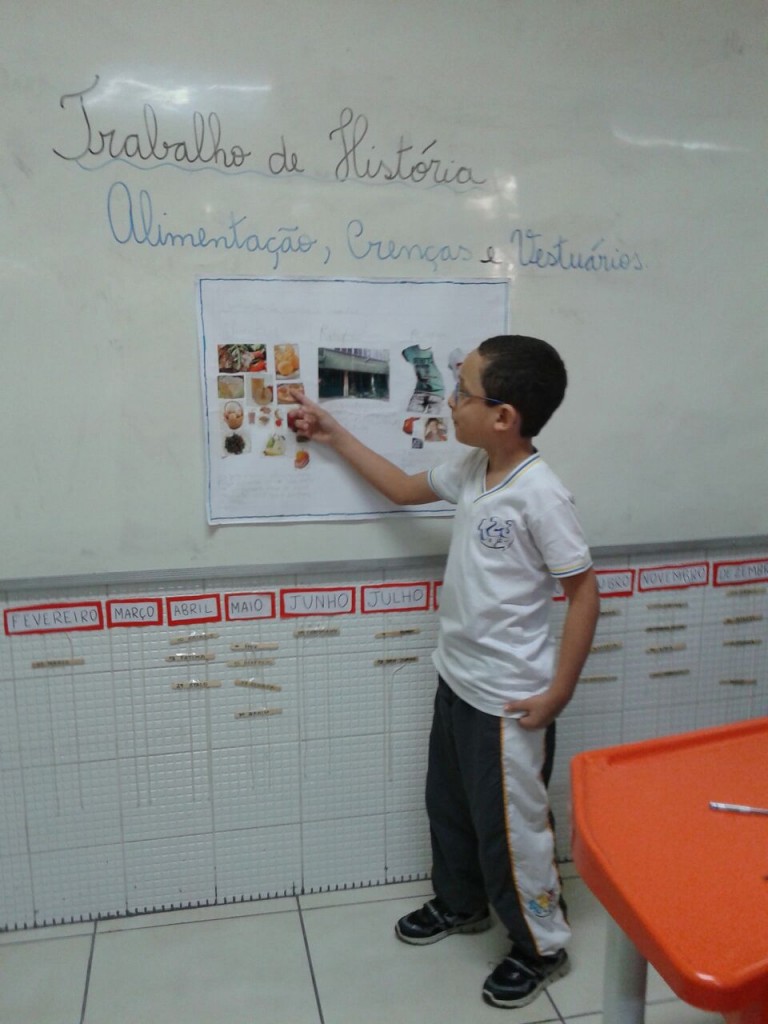 O cartaz preparado pelos alunos explorava o conteúdo de História (Vivendo em família, o dia a dia das famílias, os costumes da cada família, Famílias e costumes diferentes). Mas não bastava criatividade na execução! Era preciso vencer a timidez e apresentar. E eles se saíram super bem. Parabéns, 2º ano!