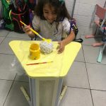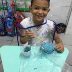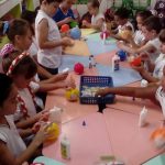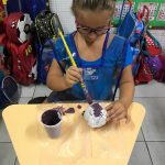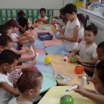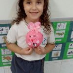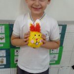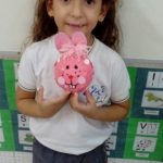 Aqui, produzimos com o 1° ano coelhinhos usando material alternativo: bola de aniversário, cola, jornal, tinta e papelão. Além de muita criatividade